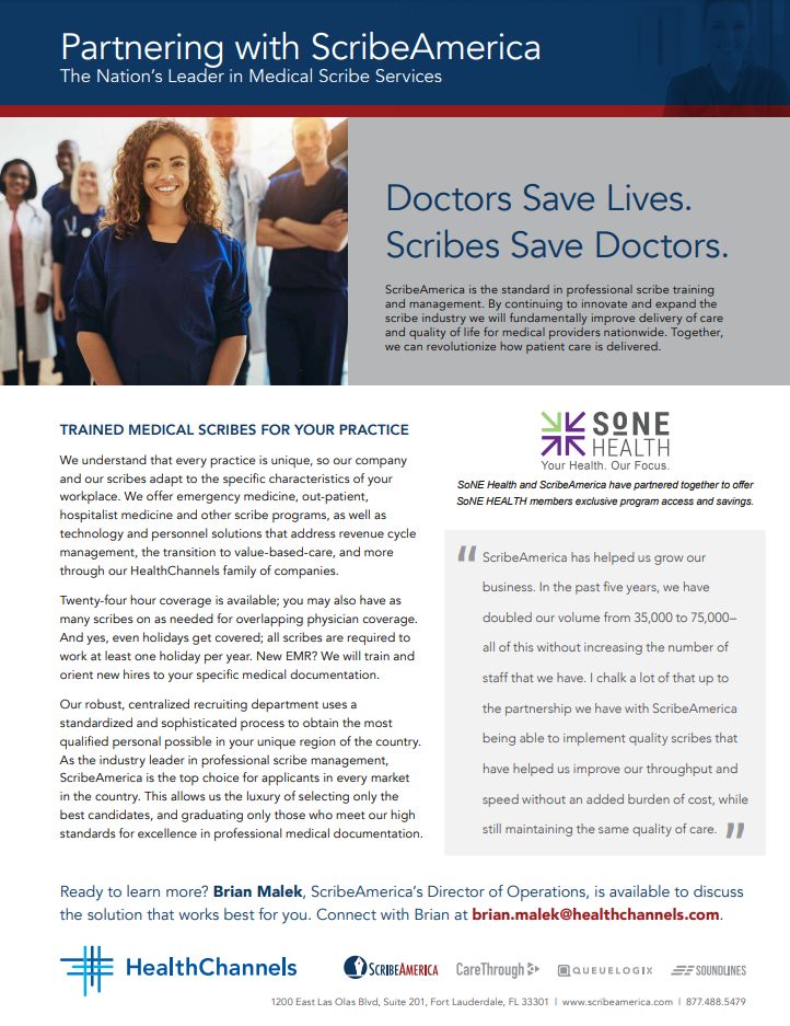 ScribeAmerica is the nation’s most frequently used medical scribe company with more than 20,000 employees in 50 states providing professional services for over 3,500 clients. With a ScribeAmerica scribe program, providers can increase reimbursements, leave on time and improve job satisfaction, while delivering more efficient patient care directly at the bedside, not behind a computer. Let us show you how ScribeAmerica can help you increase productivity and spend more time with your patients.